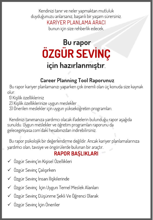 Sizin potansiyel yeteneklerinizi, size uygun kariyer seçenekleriyle eşleştirir. 15 dakika kadar kısa bir sürede uygulanır. Kişisel özellikleriniz ve bunlara uygun mesleklerle üniversitede okumanız önerilen bölümleri hemen rapor.