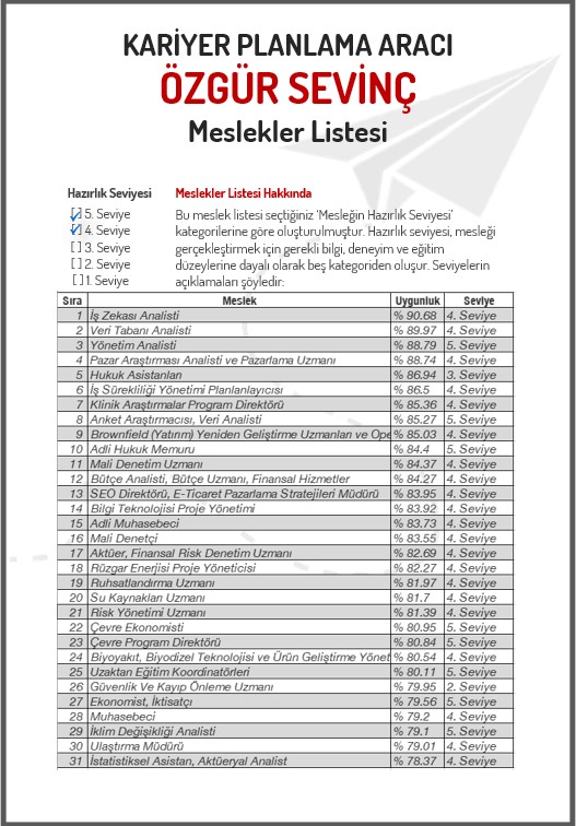 Kariyer yolculuğunda başarı ve mutluluk için, seçilen mesleğin kişinin özellikleriyle uyumlu gerekir. KPA Meslekler Listesi, hazırlık seviyesine ve uyum oranına göre sıralanır.